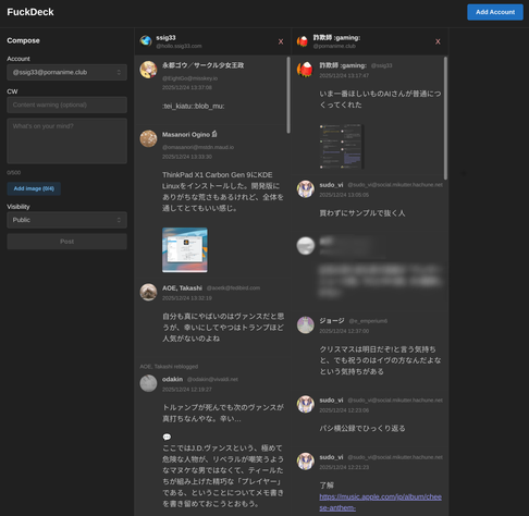 複数インスタンスをtweetdeckのように閲覧することができ、しかもブラウザで動くMastodonおよび互換APIサーバーのクライアントを作った。